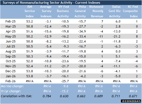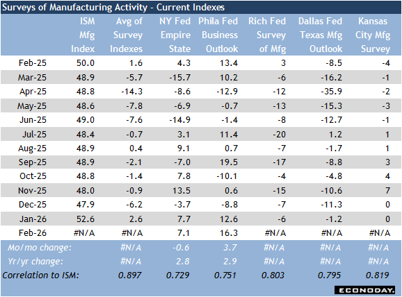 The Dallas Fed survey of manufacturing is Monday at 10:30 ET followed by the service sector survey at 10:30 ET on Tuesday. The Richmond Fed releases its surveys of manufacturing and nonmanufacturing at 10:00 ET on Tuesday. The Kansas City Fed survey of manufacturing is set for Thursday at 11:00 ET and the service sector survey is at 11:00 ET on Friday. The manufacturing and nonmanufacturing surveys from the New York Fed were released on February 17 and 18, respectively. The Philadelphia survey of manufacturing was reported on February 19 and the services sector survey will be at 8:30 ET on Tuesday.